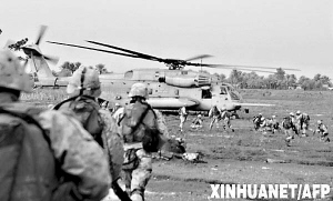 右图为美国军方2004年11月23日发布的美军士兵在叙伊边境附近执行任务后乘坐直升机离开的资料照片。