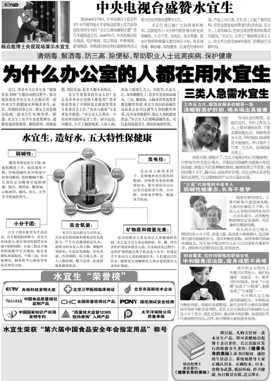 郑重提醒:当前市场上,出现诸多打着水宜生旗号的假冒、仿制、伪劣产品在个别药店、保健品店及商场保健品专柜低价违法销售,严重侵害消费者利益。为了维护您的合法权益,请到正规授权网点咨询购买。使用假产品对您的身体所造成的后果,我公司概不负责。同时,发现假货后消费者请到工商部门举报。