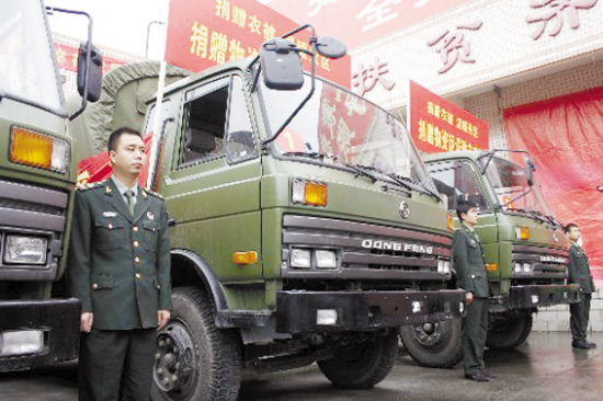 10月28日,运送御寒衣被的车辆整装待发。当日,四川省向汶川地震灾区捐赠的首批御寒棉被、衣裤、棉帐篷等物资启运。这批物资包括棉被7.3万床,棉衣裤3万套(件)、棉帐篷2000顶,将运往阿坝、广元、绵阳等10个地震灾区和高寒地区。 新华社记者 叶建平 摄