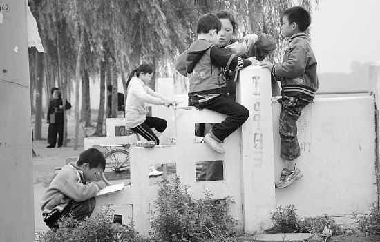昨天中午时分,市区某桥头,两个小男孩骑在桥栏上,一边写着作业,一边轮流吃着家长喂到嘴边的饭;身后,还有一个男孩正蹲着认真地写作业…… 这位母亲说,她在附近做小本生意,中午回不了家,孩子都是随便吃点饭,随处做作业。 晚报记者 朱海龙 摄