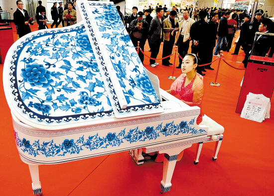 10月28日,一名少女在弹奏青花瓷钢琴。当日,一架标价为46.9万元人民币的青花瓷钢琴在中国东北亚(沈阳)进口商品博览会上亮相。这架名为“琴瓷”的钢琴,琴身上的瓷纹由手工雕刻而成。 新华社发