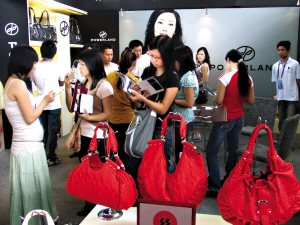一参展企业在皮具节上推出的时尚皮包,吸引了不少参观者(10月29日摄)。记者从10月29日开幕的第八届中国(狮岭)皮革皮具节上获悉,“中国皮具之都”广东狮岭出台了提升产业的九项措施,包括投资2900万元建立专业的皮具设计研究所,以提高企业在全球竞争中的产品附加值,积极应对“金融海啸”的严峻挑战。 新华社记者 黄玫 摄