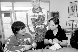 10月30日,来自香港教育学院的黄素兰博士(右一)与杭州市健康实验学校的智障孩子一起上手工课。当日,参加杭州国际教育创新大会的香港、澳门等地的教育专家们来到杭州市健康实验学校,了解这所特殊学校里的智障孩子们的创造力和想象力,并和孩子们一起制作手工艺品。新华社 发