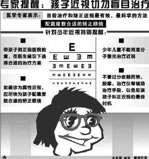 ●配镜后要正确配戴 已确诊为真性近视,就该配一副合适的眼镜加以矫正,并经常、正确地配戴。戴镜不仅是为了增进视力,还能使眼睛的调节机能恢复正常状态,避免眼睛疲劳度数增加。