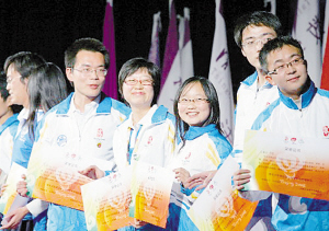 11月1日,清华大学奥运会、残奥会志愿者颁奖晚会在北京清华大学大礼堂举行,曾参与北京奥运会和残奥会志愿服务的清华学子再次穿起志愿者服装,并领到荣誉证书。 新华社发