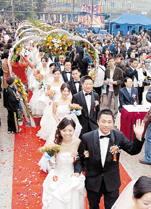 11月2日,新人们排队通过鲜花拱门。当日是第二个重庆市农民工日,由共青团重庆市委员会、重庆市青年联合会共同主办的第二届重庆市进城务工青年集体婚礼在重庆市江北区观音桥广场举行。30对来自重庆各地的进城务工青年新人携手踏上红地毯,在亲人、朋友和热心群众的祝福声中步入婚姻的殿堂。 新华社记者 刘潺 摄