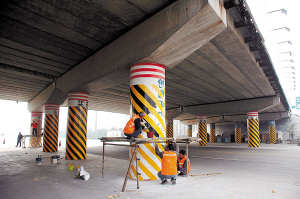 昨日,在市区周商路上,施工人员正给高速公路立交桥的桥柱刷夜间反光漆。据了解,这几年里,由于没有反光警示标志,不少市民夜间行至此处时撞上桥柱(本报曾多次报道)。一位经常夜间回周口的路人说,看见桥柱刷上反光漆,他感觉安全多了。