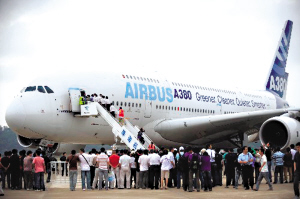11月3日,抵达珠海机场的空客A380客机引来众人围观。当日,目前世界最大客机——被称为“空中巨无霸”的空客A380客机飞抵珠海机场。从11月4日开始,这架客机将在第7届中国国际航空航天博览会(珠海航展)上进行静态展示及飞行表演。 新华社记者 卢汉欣 摄