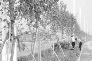 昨天,工人们在市区东环路修整绿化带。我市自10月份开始,对东环路沿线进行绿化,种植大叶女贞等树木十多种。晚报记者 朱虹 摄
