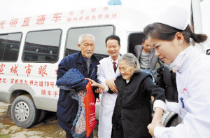 11月5日,一名老年眼疾患者乘坐“光明直通车”就诊。安徽省宣城市眼科医院在宣城市慈善协会的支持下,实施“光明直通车”慈善助盲工程,在全市部分山区农村开通了专车,免费接送眼病患者,帮助农村眼病患者及时就诊。 新华社记者 王雷 摄