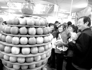 11月6日,参观者在杨凌农高会上观看“造型大苹果”。在11月5日开幕的杨凌农业高新科技成果博览会上,随处可见的“丰收果”显示了30年来我国农业科技的巨大进步,让参会者大饱眼福。