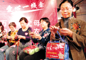 11月6日,几位“爱心妈妈”在活动现场编织“爱心毛衣”。当日,安徽省合肥市启动2008年“恒爱行动”。这项活动由中国儿童少年基金会等单位共同主办,参加活动的“爱心妈妈”将用发放的500公斤“爱心毛线”为孤残儿童编织1000件毛衣。 新华社发