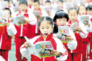 11月10日,湖北宜昌市东山小学学生在校园举行的阅读节上开展国学经典诵读。当天,湖北宜昌市东山小学举行“国学经典、古韵东山”阅读节活动。该校自2007年开设国学课堂以来,通过国学经典讲读、书法练习、民族乐器演奏等教学内容,让学生从小感受中华传统文化的博大精深,提高综合素质。 新华社发 黄翔 摄