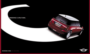 为了全新推出MINI,在广告宣传上自然更加用心。我们看到的3张图片上用了非常醒目的英文字母作为最直接的表述方式。第一个字母为C,后面的句子为“Cornering is spelt MINI”——MINI意味着弯道。而在C字母的末端就是一辆运动中的MINI,其适应弯道的特点被描述得非常直白。