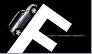 终极版的MINI宣传画上,字母不再是平躺,而是成为了一个站立着的F。后面的句子则更为夸张,“Find out what your girlfriend had for breakfast”——“看看你的女友早餐都吃的什么”。这句话的言下之意就是说MINI的表现将让你无法控制你的胃,吃的什么基本上全部都会吐出来。虽然这有些夸张,但是MINI的特性就是灵活,此则广告给人的第一印象就是通过很强的视觉冲击,让人们对MINI的个性有更深刻的理解。