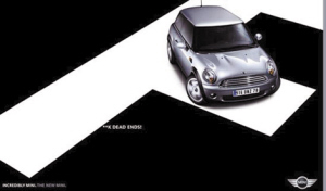 而第二张图中换成了字母F,图中的句子也换成了“FUCK DEAD ENDS”——该死的死角!图中一部MINI在躲闪腾挪的瞬间走进了F下的死角中,这不仅展现出MINI身材的苗条,同时也体现出了MINI出色的操控设计。