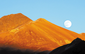 11月12日,在距西藏拉萨70多公里处的一座山上,太阳尚未落山,一轮明月就爬上山头,出现日月同辉的景象。 新华社发