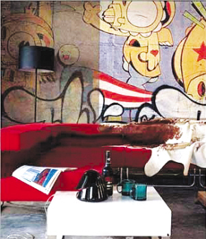 背景墙有较大面积可利用,可描绘有主题的大型涂鸦作品,建议选取较为隽永的图案,否则,短时期内经常性改画背景墙的工程量实在太大。大型涂鸦作品的创作,最好还是请比较专业的人员进行颜色搭配设计,可以保证颜色间的协调性,避免影响居住情绪。