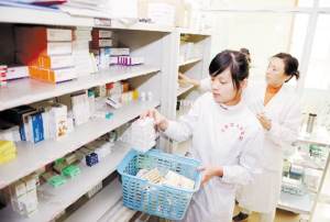 11月13日,青岛市湛山社区卫生室护士王静(左)在摆放调价药品。当日,山东省青岛市第二批119种零差率药品陆续进入各社区医院,市民可就近按需购买更多的放心药和廉价药。据了解,目前青岛社区医院的零差率药品种类已由103种增至222种,同种类药品价格较二级以上医疗机构平均低35.27%。