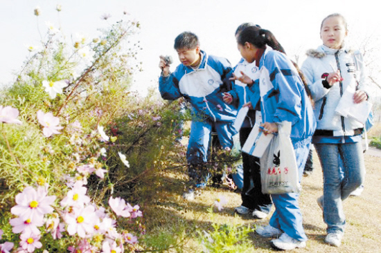 11月15日,在天津湿地生态公园桥园,参加科学实践课的学生记录植物分布情况。 当日,天津市一批中小学师生来到市区最大的湿地生态公园——桥园,进行水质及生物多样性调查检测。学生们在老师带领下组成“绿色小分队”,将定期检测记录公园湿地水质和周边生物多样性特征,让科学实践课真正走入大自然。 新华社发 李想 摄
