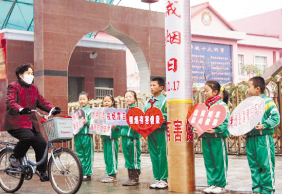 11月17日,一位市民从小学生制作的“巨无霸香烟”前经过。当日是“世界戒烟日”,山东省枣庄市市中区回民小学的学生用旧报纸等制作了一支长3.6米的“巨无霸香烟”模型,竖立在学校大门旁边,并组织戒烟小分队劝告市民戒烟。 新华社发