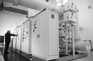 随后,我们戴上安全帽,进入变电站的核心区——GIS(全封闭组合电器)室。在这间只有3间房子大小的室内,看不到一根高压线路,取而代之的是几个大档案柜似的全自动操控仪器和错综复杂水桶般粗细的钢铁管道,“城区10多条高压线路和供电设备都被包在管道里”。接下来李建军的话让记者感到很吃惊:“你们别看GIS室占地小,它里面可都是浓缩的精华。举例来说,一般一所变电站占地约8~9亩,而采用GIS设备后,占地缩小了几十倍。打个比方,它类似于电脑集成块。”除了这些好处,“跟以前相比,普通老设备每年至少要检修两三次,每次检修前必须先停电。前几年特别是生活在沙颍河北岸的居民,不是压负荷,就是停电检修。而使用GIS后,不容易出毛病,几年甚至数年都不需要停电检修,这就大大提高了供电可靠性。”打开最后一扇门,隔着二楼栏杆,我们看到了安放在一楼的一个大块头,“这就是全市110千伏变电站中迄今为止容量最大的变压器了,(容量)5万千伏安,可以同时带起50万个100瓦的灯泡。