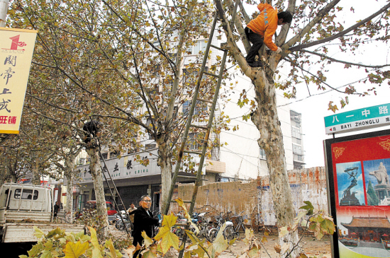 昨日,在市区八一中路,几位园林工人正在修整树木。从当日起,园林部门开始对主干道树木进行修剪。 晚报记者 朱鸿 摄