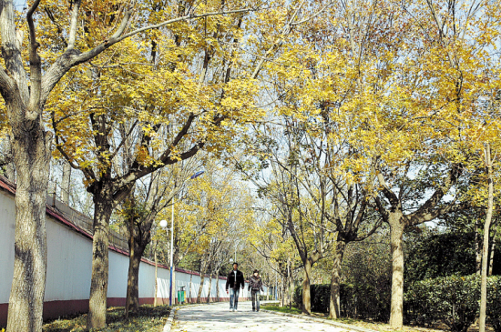 连日来,在周口人民公园内,由于北风送寒,气温骤降,园内枫树和法国梧桐树叶变黄,在蓝天的映衬下,分外美丽。晚报记者 朱鸿 摄