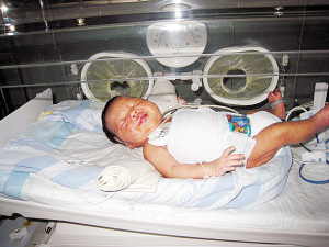 20日上午11时许,记者和项城市花园办事处的代表在征得院方同意后,和大宝小宝的爸爸一起穿着消毒服走进新生儿重症监护室,近距离接触了小哥俩。他们被分别放置在两个不同的暖箱里,小宝的鼻子里插着一根吸氧管正在输氧。大宝显得很舒坦,蜷着小腿睡得正香。“这是手术后我第二次来看孩子。”站在一旁的孩子爸爸赵卫华一会儿看看大宝,一会儿看看小宝,脸上挂着微笑。