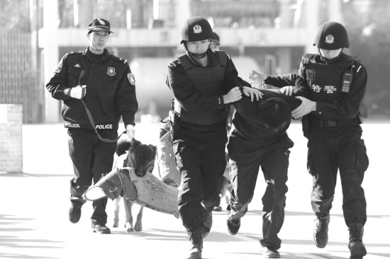 11月19日,郑州警方演练制服“歹徒”。当日,河南省公安机关“亮剑-2008”大练兵成果汇报展示演练在郑州市西郊举行,来自河南全省各地公安机关各警种的700名警界精英在7个极具实战性的汇报演练中展示打击犯罪、处置突发事件的综合能力。新华社发