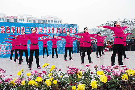 项城市职业中专高度重视学生的体育活动,广泛开展学生的体质和体能训练,确保全体学生身体健康。图为该校学生在全民健身运动会上表演健美操。 牛立坡 摄