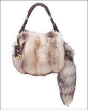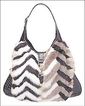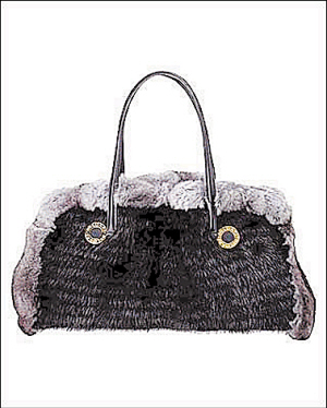 黑色皮草包身上灰色翻毛饰边成为包包的点睛,灰与黑的色彩搭配给视觉以柔和和愉悦。