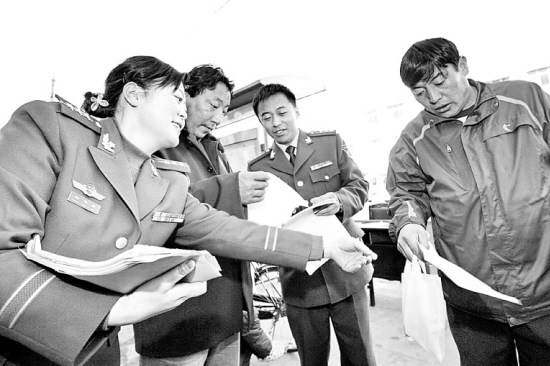 11月23日,武警西藏总队的干部为群众发放法制知识宣传单。当日,武警西藏总队退伍老兵在临别拉萨之前开展“为军旗添彩,为第二故乡做贡献”活动,老兵们充分利用在部队学到的一技之长,走上拉萨市大街小巷为各族群众进行法律宣讲、种养殖技术培训、理发、修理自行车、送医送药等义务活动,受到各族群众的欢迎。 新华社发