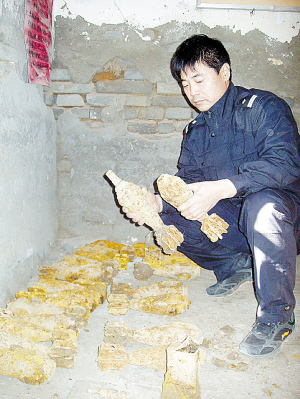 “俺只是在电视里见到过炮弹,没想到从俺家的地基里挖出了炮弹!”昨日上午11时,记者和民警闻讯赶到现场时,张洪才还心有余悸,周围村民更是吓得躲在几十米之外。张洪才说,自己准备盖两层小楼,便雇来一台小型挖掘机挖地基。上午8时50分,挖掘机挖到地基北侧时突然挖不动。由于地基北侧在数年前是村里的一条小河沟,后被填平,张洪才以为是碰到了原先河沟里的石头。孰料,挖掘机再挖时,仍然挖不动,而且挖掘机齿上有一些锈迹斑斑的东西。挖掘机主恐怕损坏了挖掘机,便要求人工挖掘。没想到,工人们竟挖出一箱锈迹斑斑的铁疙瘩。