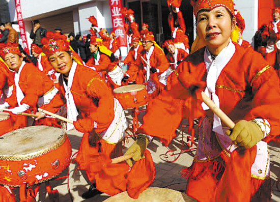 “大妈”鼓乐队员在表演(11月23日摄)。西宁市一支由中老年妇女组成的女子鼓乐队,时常在各种文艺活动中表演,成为当地一道靓丽的风景线。 新华社发