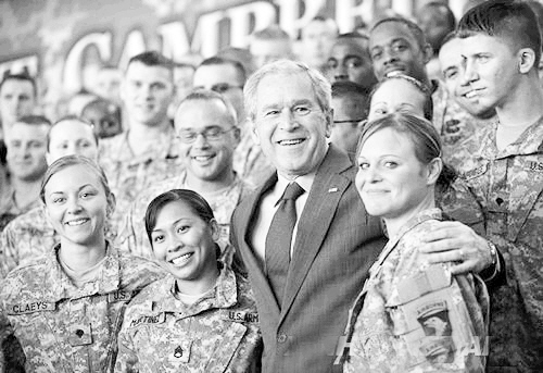 25日,美国总统布什在肯塔基州坎贝尔堡与官兵合影。 感恩节前夕,布什来到美军第101空降师总部,感谢从伊拉克和阿富汗归来的官兵。每年11月的第四个星期四是美国的感恩节,今年的日期为11月27日。新华社发