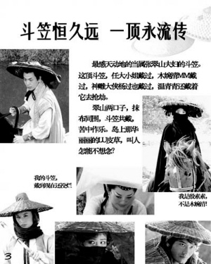 昨日,在某娱乐论坛里,一位署名“倚周刊”的网友图文并茂地“揭露”了这部正在热拍的《倚天屠龙记》。该网友称,由于受到金融危机的影响。剧中,多款服饰、道具都曾在张纪中以往的影视作品中出现过。如:武当派的道服来自于《神雕侠侣》中的全真教;周芷若的发簪出自于《大唐游侠传》里韩芷芬的头饰,而这款发簪也同样被杨不悔所佩戴,只不过位置从头顶换到了后脑勺;“最感天动地的是张翠山夫妇的斗笠,这斗笠任大小姐戴过(《笑傲江湖》);木婉清MM(《天龙八部》)也戴过;神雕大侠杨过也戴过;温青青(《碧血剑》)还戴着它去抢劫……”甚至将其称之为“斗笠恒久远,一顶永流传”。