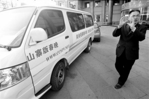 本报综合消息 “向央视春晚叫板,给全国人民拜年。”,并标注了山寨版春晚网址:www.ccstv.net。11月28日北京朝阳区华严北里8号院2号楼下,一辆写有挑衅口号的面包车惹得市民驻足观看。这辆“牛车”的车主,四川小伙子老孟说,要自办一场草根参加的山寨版春晚,时间与央视春晚同步,通过网络直播。目的就是向央视春晚叫板。