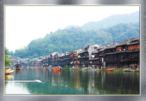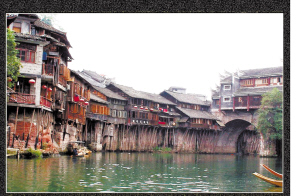 沱江是凤凰的母亲河,坐上乌篷船,听着艄公的号子,看着两岸已有百年历史的土家吊脚楼,别有一番韵味。顺水而下,穿过虹桥,一幅江南水乡的画卷便展现于眼前:万寿宫、万名塔、夺翠楼……一种远离尘世的感觉犹然而生。