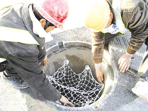 12月8日,施工人员在合肥街头道路窨井内安装防护网。从8日开始,合肥市公路局开始在一些市政道路窨井中安装一种新型的防护网,以防止井盖被盗或破损后行人坠井事故的发生。防护网由尼龙绳编织而成,可承载一名成年人的重量。新华社发