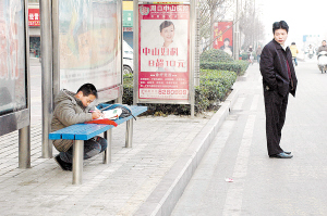 昨天早晨,在市区七一中路一公交站牌下,一名学生抓住等车的空隙趴在座椅上写作业。当天,寒意颇浓,孩子写作业的场面让许多家长投来心疼的眼光。
