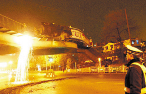 12月13日晚,工人开始对巢湖市区草城街的人行天桥进行拆除施工。投入使用15余年的巢湖市草城街人行天桥,日前被鉴定为“危桥”,安全隐患突出,于当日被拆除。 新华社发