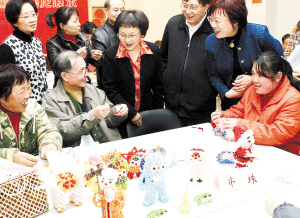 12月13日,上海市殷行社区的居民正在向参观的嘉宾介绍手工艺品的制作方法。当日,上海市在部分社区启动“邻里互助一家亲、文明和谐迎世博”系列活动,活动以“亲情、友情、邻里情”为主线,引领上海500万家庭践行关爱互助的睦邻文化,倡导守望相助的良好民风,为2010年中国上海世博会营造文明环境。 新华社记者 陈飞 摄