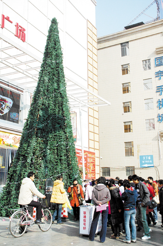 12月14日,在市区七一中路某商场前,一棵两层楼高的大型人造圣诞树拔地而起。这是目前周口出现过的最高的圣诞树。 晚报记者 朱海龙 摄