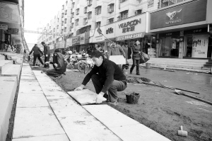 近日,工人忙着在市区新华步行街铺设新的地砖。据介绍,改造后的步行街不仅路面平整,还将有路灯和休息椅等设施,可以更好地方便前来购物的市民。