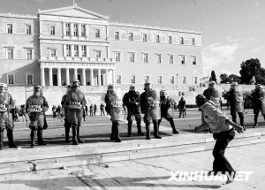 12月12日,在希腊首都雅典市中心议会大厦前,一名希腊青年向警察投掷石块。