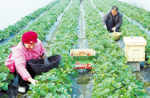 12月14日,山东省郯城县港上镇向阳村农民在大棚里采摘“蜜蜂授粉草莓”。新年临近,山东省郯城县港上镇500余亩大棚“蜜蜂授粉草莓”成熟上市,果农与外地客商签订了供货合同。据介绍,采用蜜蜂授粉法种植的草莓不仅口感好,坐果率高,而且节省人工成本,效益可观。 新华社发