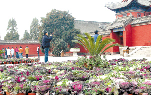 在一团团、一簇簇五颜六色的花草装点下,冬天的旅游景区不再萧条。昨天上午,记者在淮阳太昊陵景区内看到,虽然时值冬季,但大大小小的花坛造型将这里装扮得依然是五彩缤纷,游客徜徉其间,不时拍照留影。据了解,为给游客提供优美的环境,近日,太昊陵管理处在景区内布置了近万盆这样的耐寒花草。 晚报记者 杜欣 摄