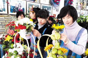 12月15日,在山东梅林花艺职业培训学校,山东轻工学院应届毕业生石婉婷(左)在跟老师学习插花艺术。面对大学生就业难的局面,山东一些应届大学毕业生做好自主创业的准备,仅在山东轻工学院就有近10位女生准备自己开花店,为此她们特意来到花艺职业培训学校参加花艺培训。 新华社发