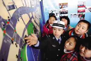 12月16日,青岛市交警支队警官在向同学们介绍校园周边交通运行模拟图。寒假临近,青岛市南区实验小学开展“平安交通迎假期”活动,通过参观122交通指挥中心、发放交通安全宣传手册、举行“交通安全在心中”征文等形式,增强同学们的交通安全意识。新华社记者 李紫恒 摄
